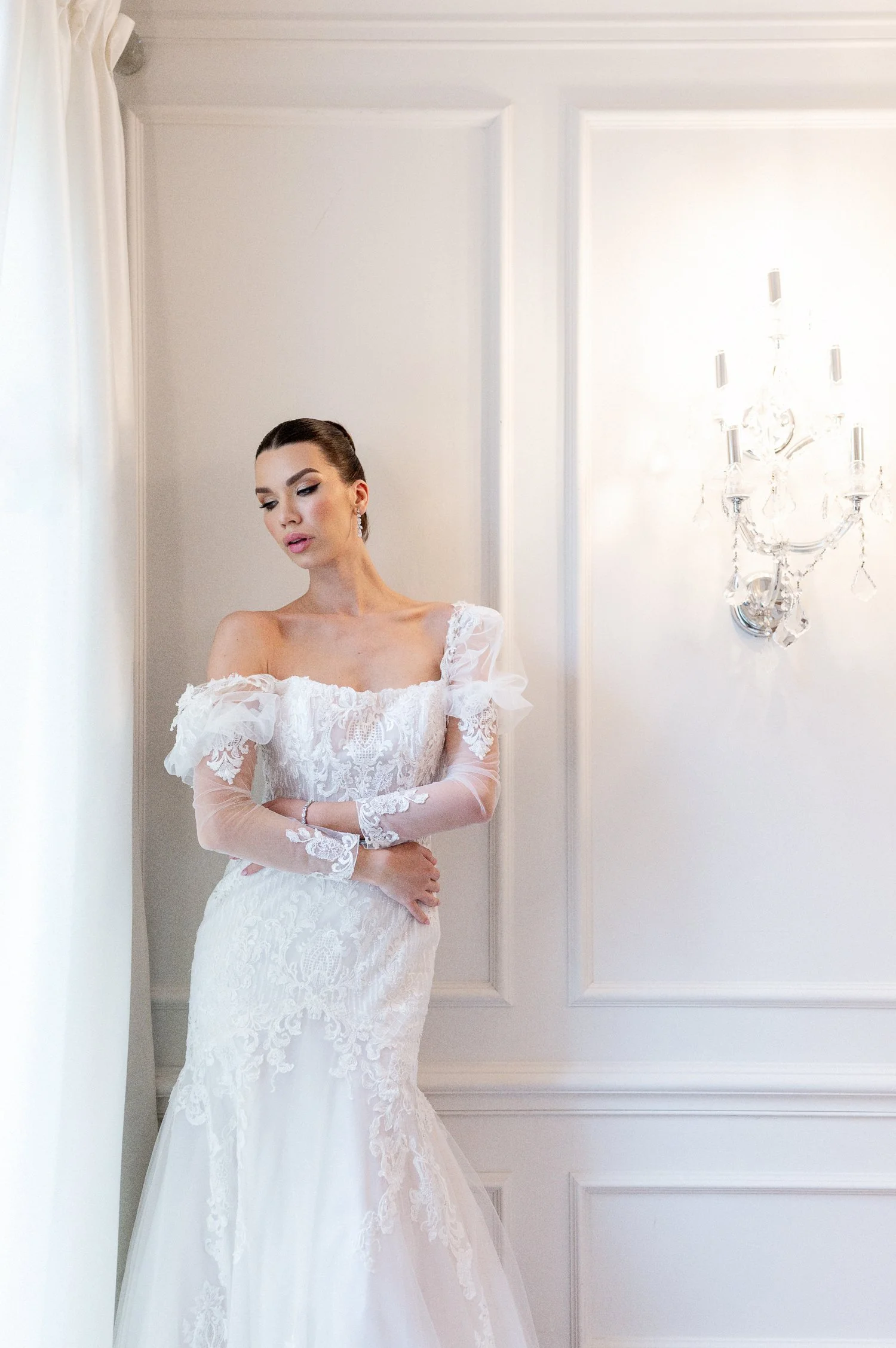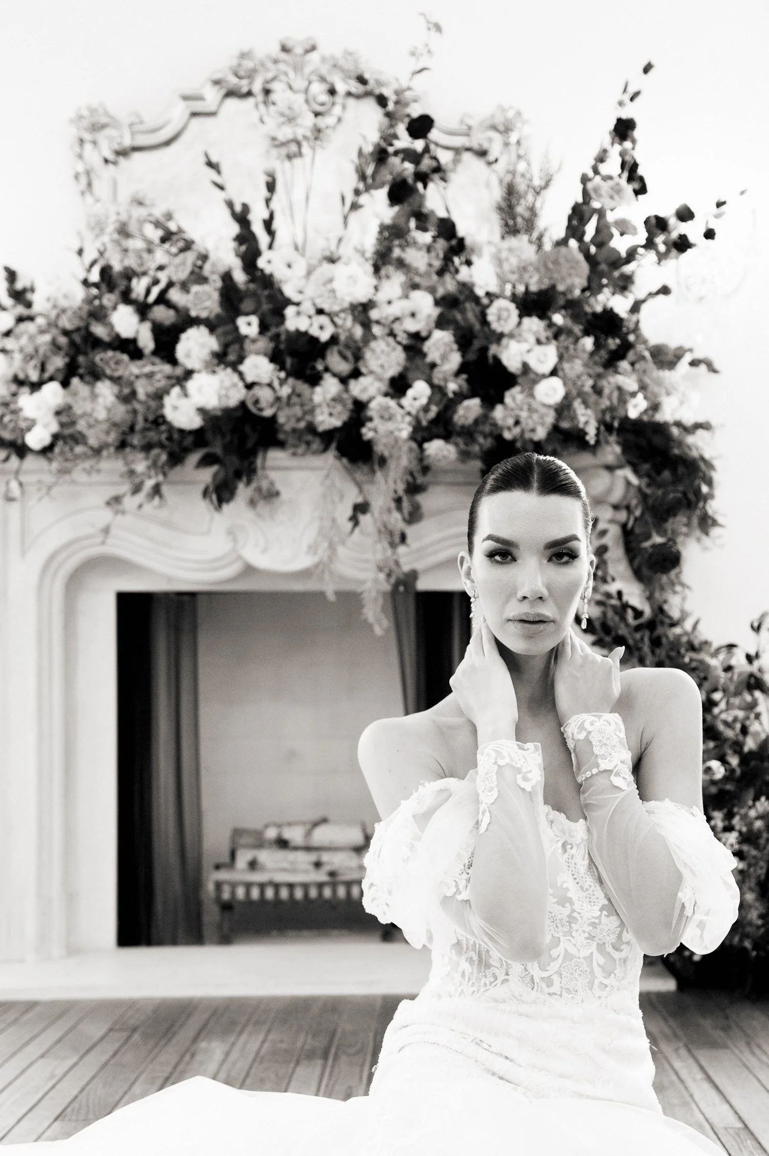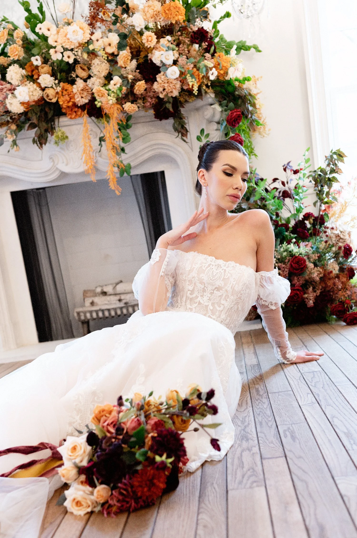 Early in my career, I thought wedding photography was my calling—only to discover in school how many genres I wanted to explore. Though I no longer book real weddings, I jumped at the opportunity to join a styled wedding content day at Ruby Manor. Moving through rooms designed to evoke a dreamy wedding day, I photographed a number of models —but some of my favourite frames came from the room with a lush floral mantle that made the perfect backdrop for our “bride.”